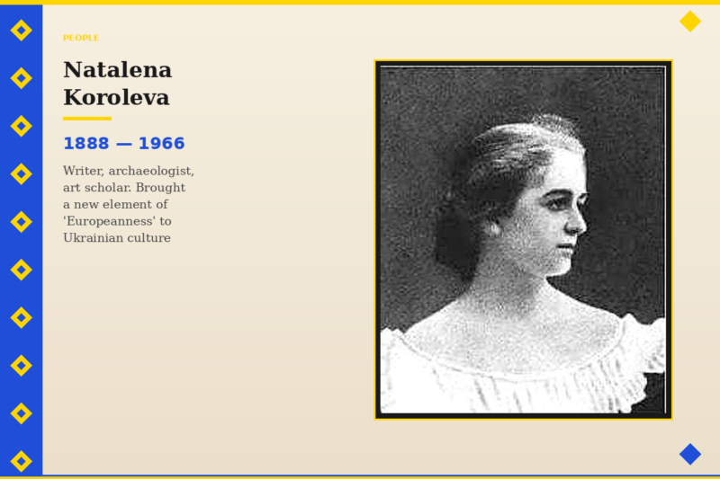 Her first literary works, written in French, began appearing in Parisian journals in 1909. The First World War found N. Koroleva in Kyiv. During the war, she joined the Red Cross and served for nearly three years at the front in the Russian army as a doctor. She was awarded the soldier’s Cross “For Bravery”, was wounded three times, and suffered typhus and several cases of pneumonia. During the Ukrainian national liberation struggle of 1917–1920, she worked in the Ministry of Foreign Affairs of the UNR, and later emigrated to Czechoslovakia, where she worked as a teacher in Prague. There she married Vasyl Korolev-Staryi, who inspired Natalena to write in Ukrainian.