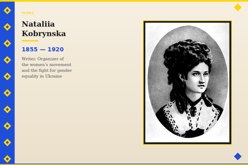 Kobrynska advocated for women’s and men’s equality in the Austro-Hungarian Empire, submitted petitions requesting women’s access to university education, and in 1884 founded the first Ukrainian women’s organization in Stanislaviv called the “Society of Ruthenian Women”. She established close cooperation with Ukrainian women in the Russian Empire. She became the initiator of the first Ukrainian women’s organization. In essence, modern Ukrainian women’s journalism began with her — something like today’s “Vogue”, but even better. The publication “Pershyi Vinok” (“The First Garland”), created under Kobrynska’s initiative, laid the foundations for women-edited magazines. Thanks to her efforts, Ukrainian women’s organizations began operating in Lviv, Chernivtsi, Rivne, and other cities of Western Ukraine.