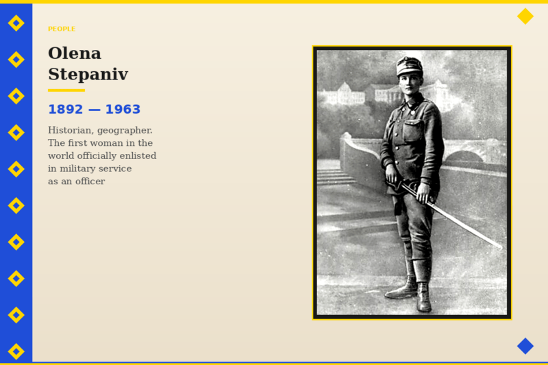 Historian, geographer, public and military figure, the first woman in the world officially enrolled in military service as an officer, a “chetar” of the Ukrainian Galician Army.