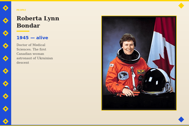 Roberta Lynn Bondar (born December 4, 1945, Sault Ste. Marie, Ontario, Canada) is the first Canadian woman astronaut and the first neurologist to go into space. She was born into a family of ethnic Ukrainians originally from Hороденка (Horodenka), Ivano-Frankivsk region. She speaks Ukrainian fluently. From childhood she dreamed of becoming a teacher. Her father set up a home laboratory for her, where Roberta conducted various biological experiments. At school she developed a passion for astronomy: she observed stars and read both scientific and science fiction literature.
