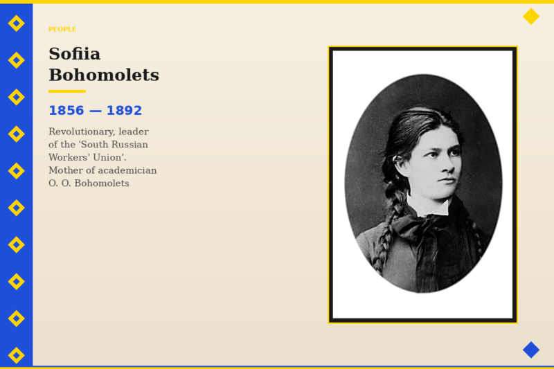 Mother of academician Oleksandr Bohomolets — Sofiia Bohomolets was a well-known revolutionary and one of the leaders of the populist organization “South Russian Workers’ Union”. Two weeks after the birth of her son, she was sentenced to death, later commuted to 19 years of hard labor.
