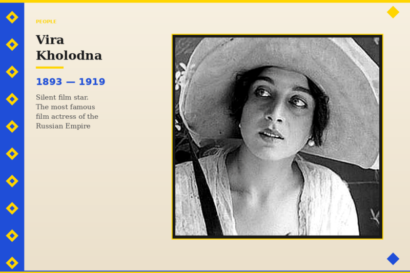 She was born in Poltava under the name Vera Levchenko. She married the lawyer Volodymyr Kholodny and took his surname. Vera Kholodna’s acting career lasted less than five years, but during that time she managed to appear in dozens of films (dramas, melodramas, short films) and became more than just a sex symbol of her era. After the release of her first film, she began receiving letters from unknown men confessing their love. Some even wrote that they would commit suicide because of their unrequited feelings for her.