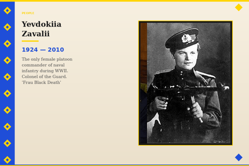 In 1943, she was sent to a six-month junior commanders’ course and, as a junior lieutenant, assigned as a platoon commander in the 83rd Marine Brigade. Earning the soldiers’ respect took time, but once earned, it was absolute. During one battle, a young inexperienced soldier tried to hide in a shell crater, but Yevdokia forced him back into the attack. In response, he shouted at her insultingly, but still went forward. After the battle formation, he repeated the behavior. Yevdokia went to the medical unit and, upon returning, asked the senior officer to read aloud a note she had been given there. It stated: “This certifies that Lieutenant Zavalii Yevdokia Mykolaivna is chaste”. After that, the soldiers’ respect for her became virtually unshakable.